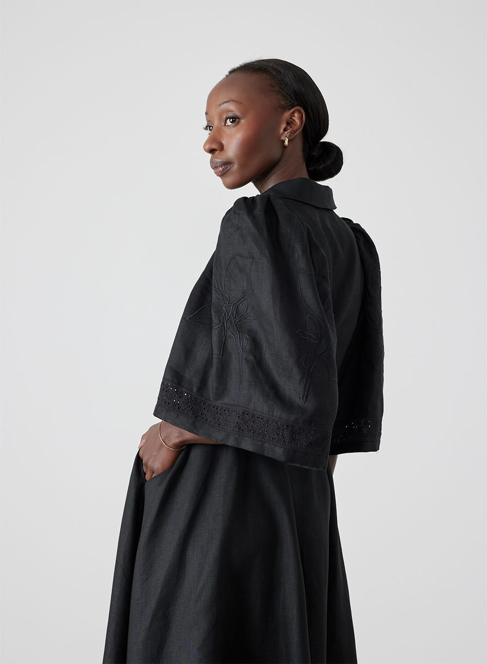 The Fleur Linen Embroidery Midi Shirt Dress is a sleek and chic style while being versatile and functional, featuring placement embroidery detailing, a classic collar, short kimono style sleeves and dual in-seam pockets