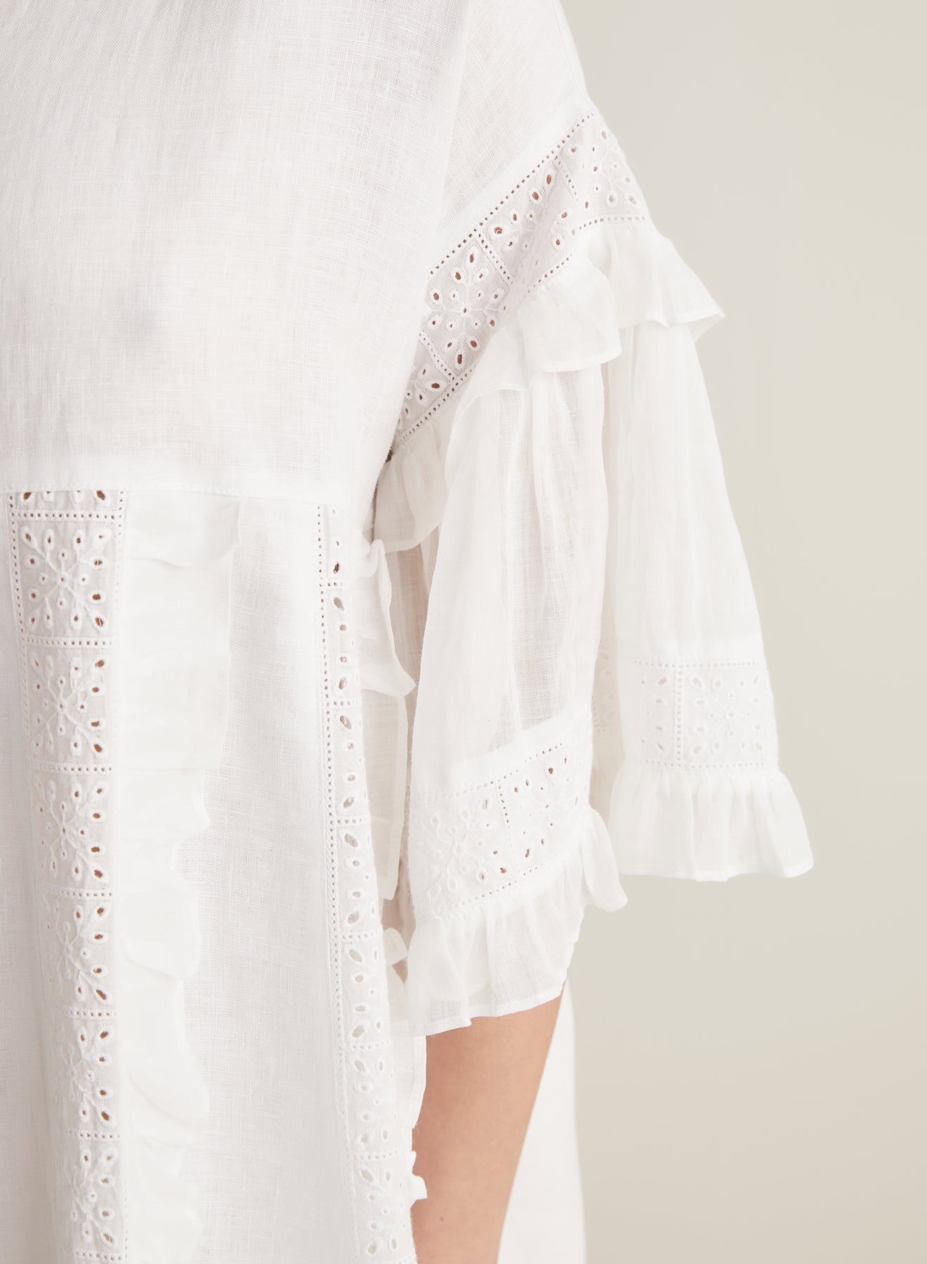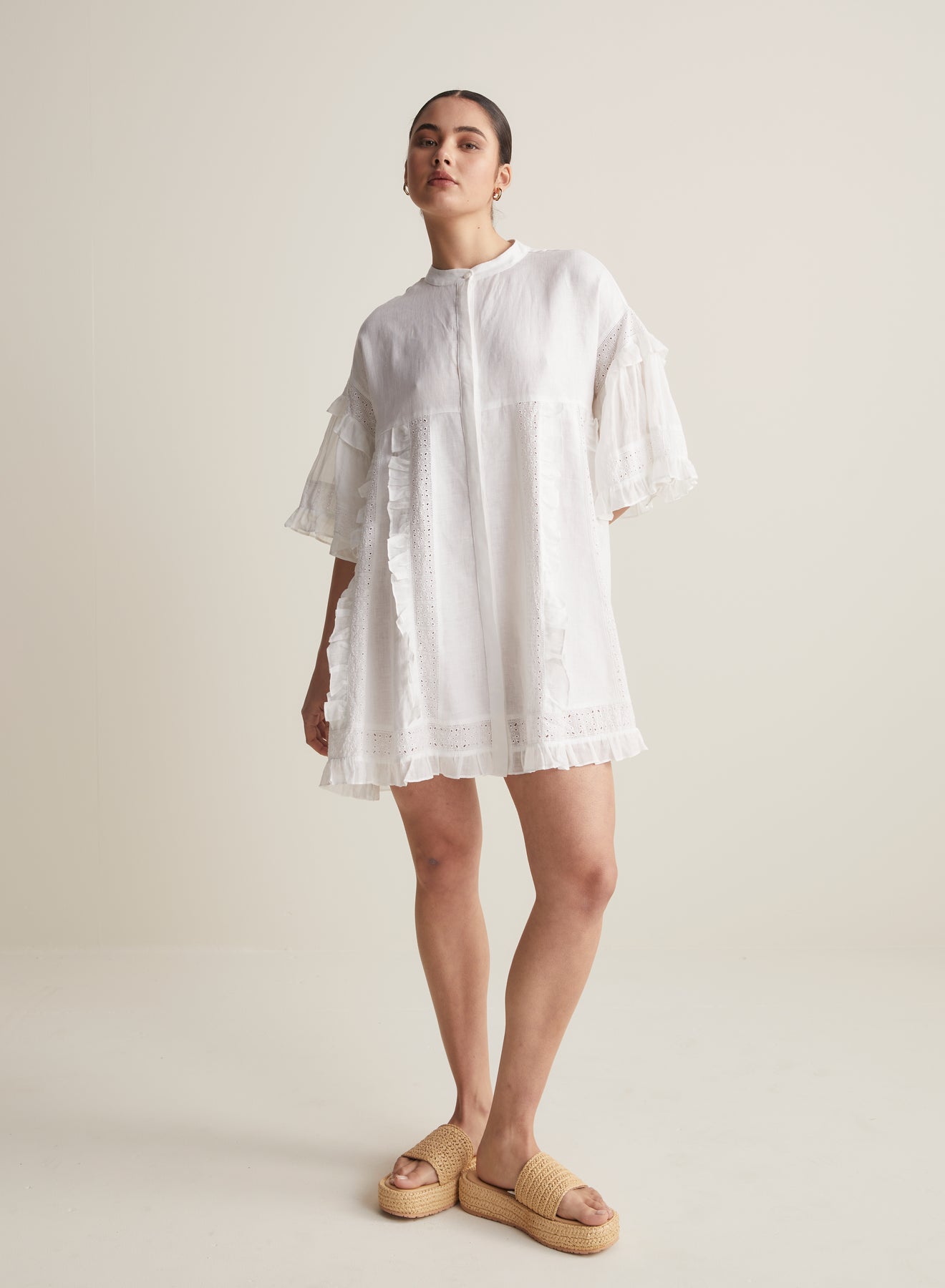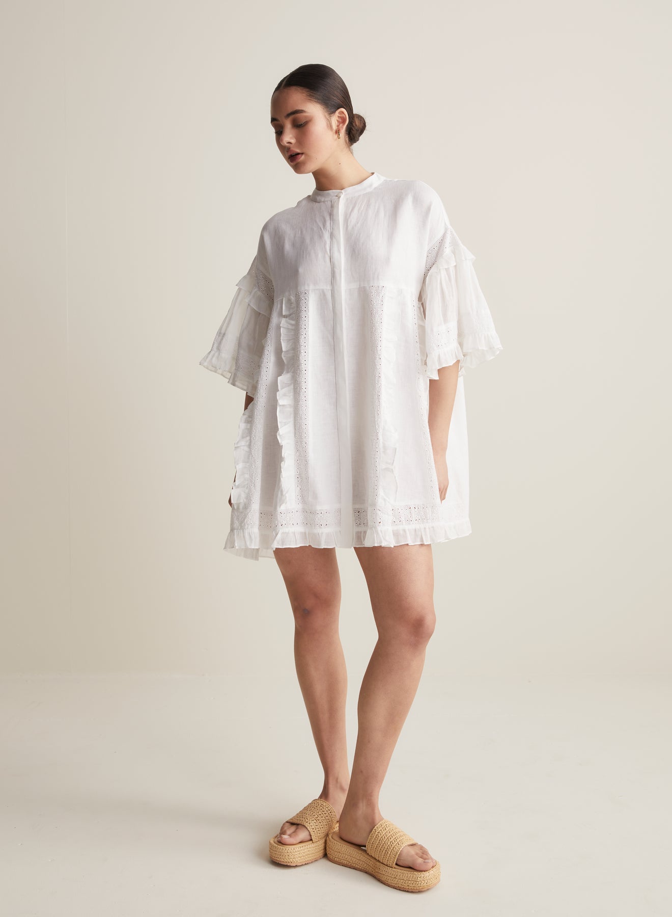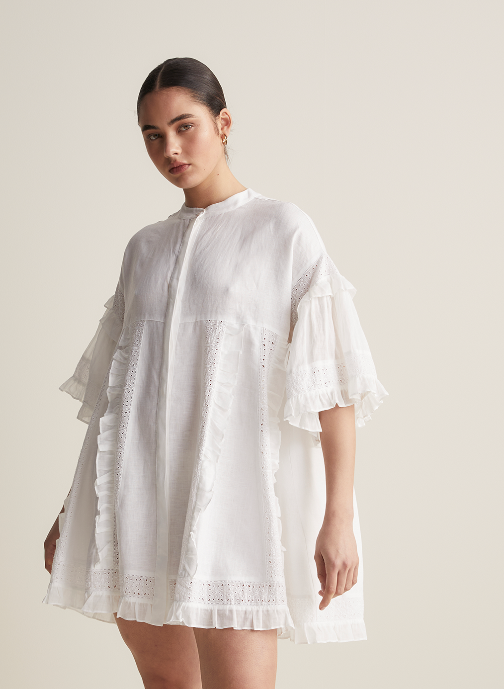 This exquisite smock shirt dress is made from luxurious European Flax® linen batiste and delicate ramie organdy. Adorned with delicate ruffles, elegant drop shoulders, and flared sleeves, it also boasts a discreet button tab for a flawless finish.