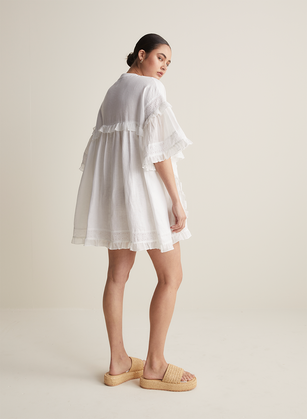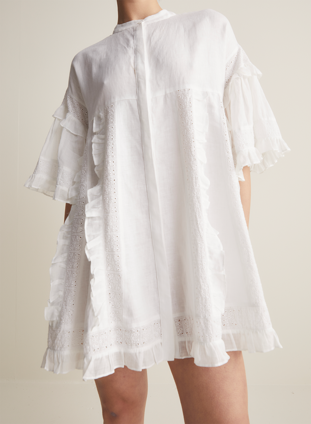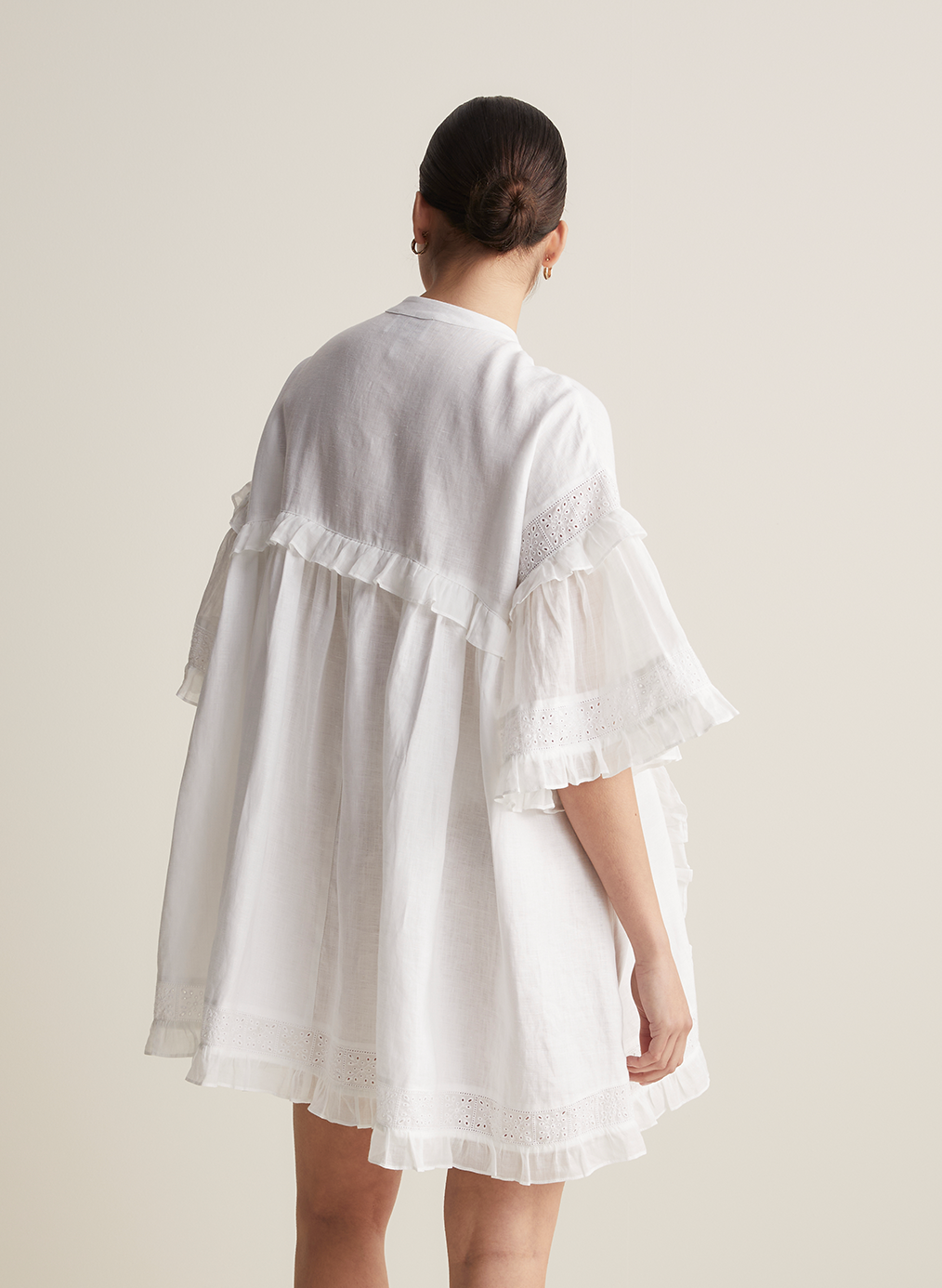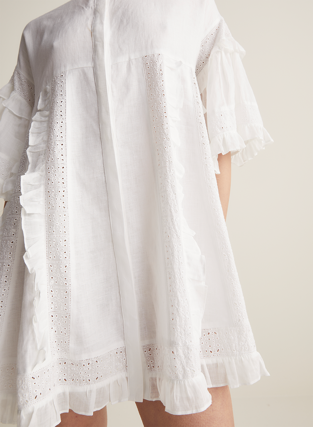 This exquisite smock shirt dress is made from luxurious European Flax® linen batiste and delicate ramie organdy. Adorned with delicate ruffles, elegant drop shoulders, and flared sleeves, it also boasts a discreet button tab for a flawless finish.