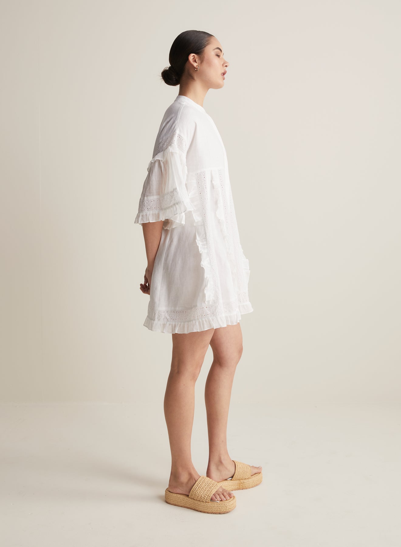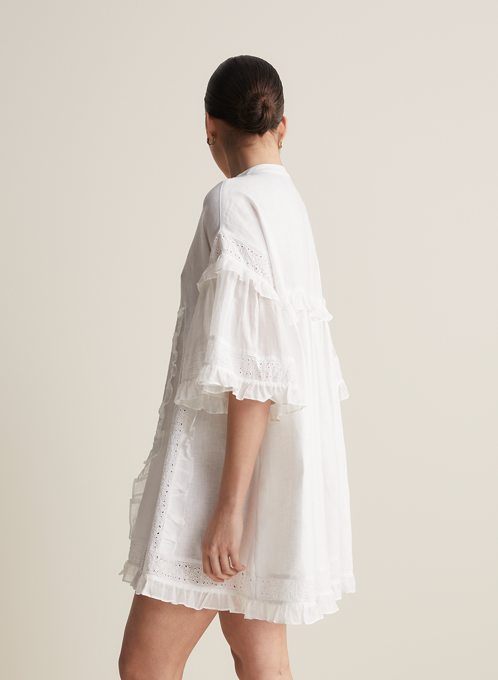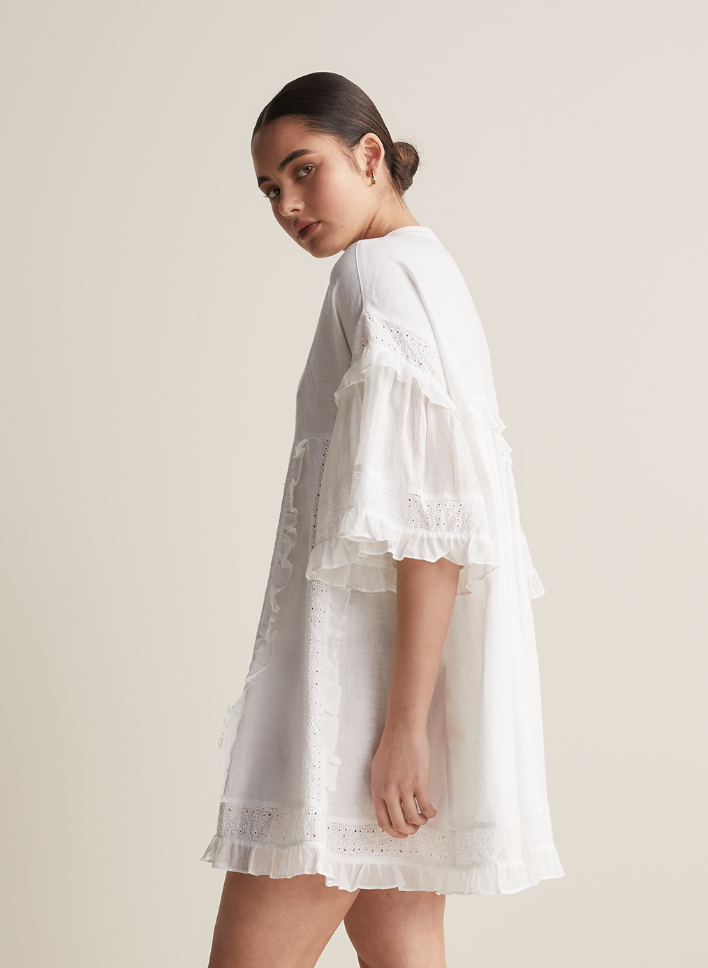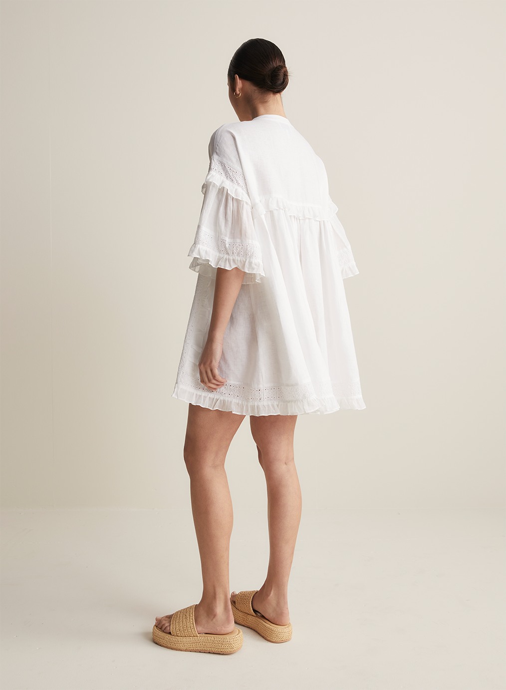 This exquisite smock shirt dress is made from luxurious European Flax® linen batiste and delicate ramie organdy. Adorned with delicate ruffles, elegant drop shoulders, and flared sleeves, it also boasts a discreet button tab for a flawless finish.