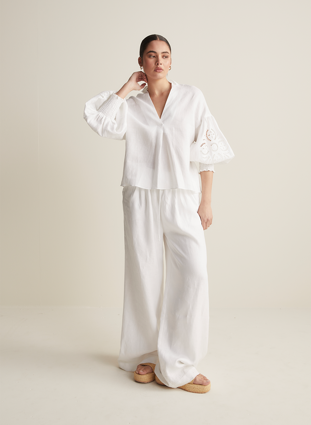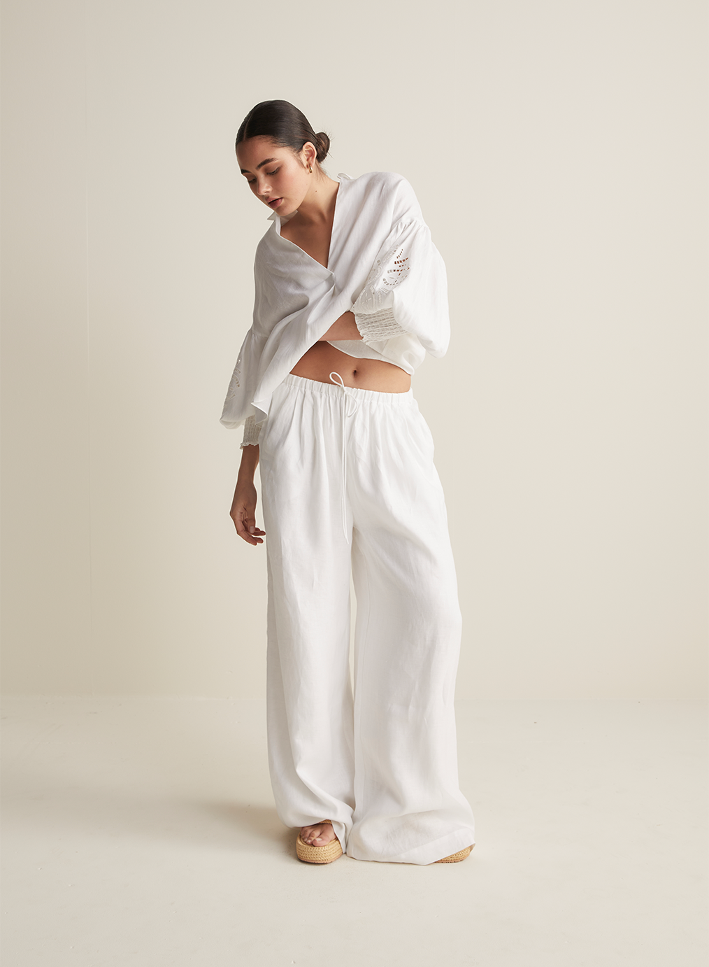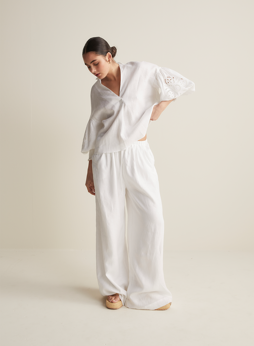The Devon Pant is a stylish palazzo pant, meticulously crafted from European Flax® linen batiste, boasting a flattering elastic waist and delicate pintucks.