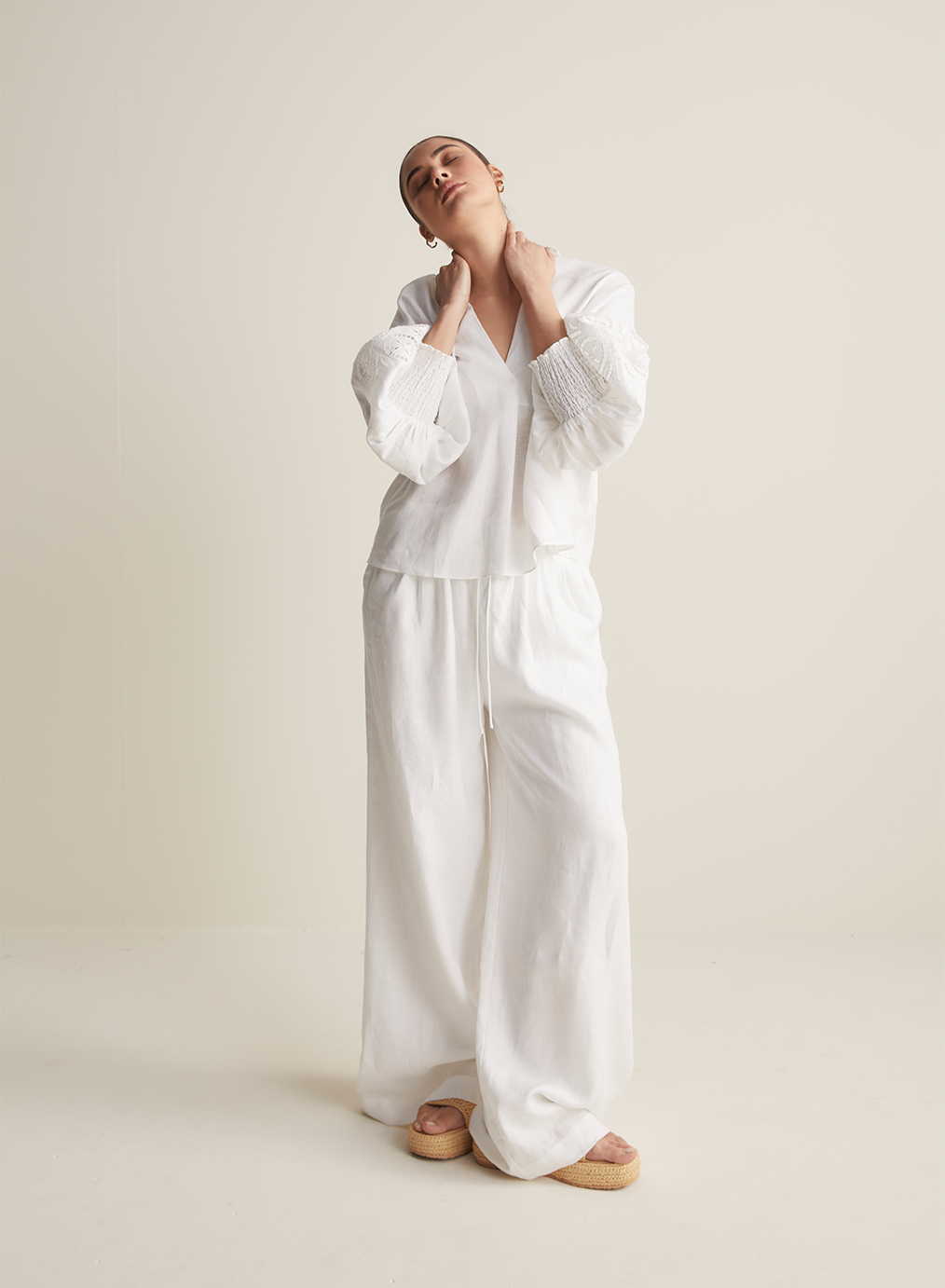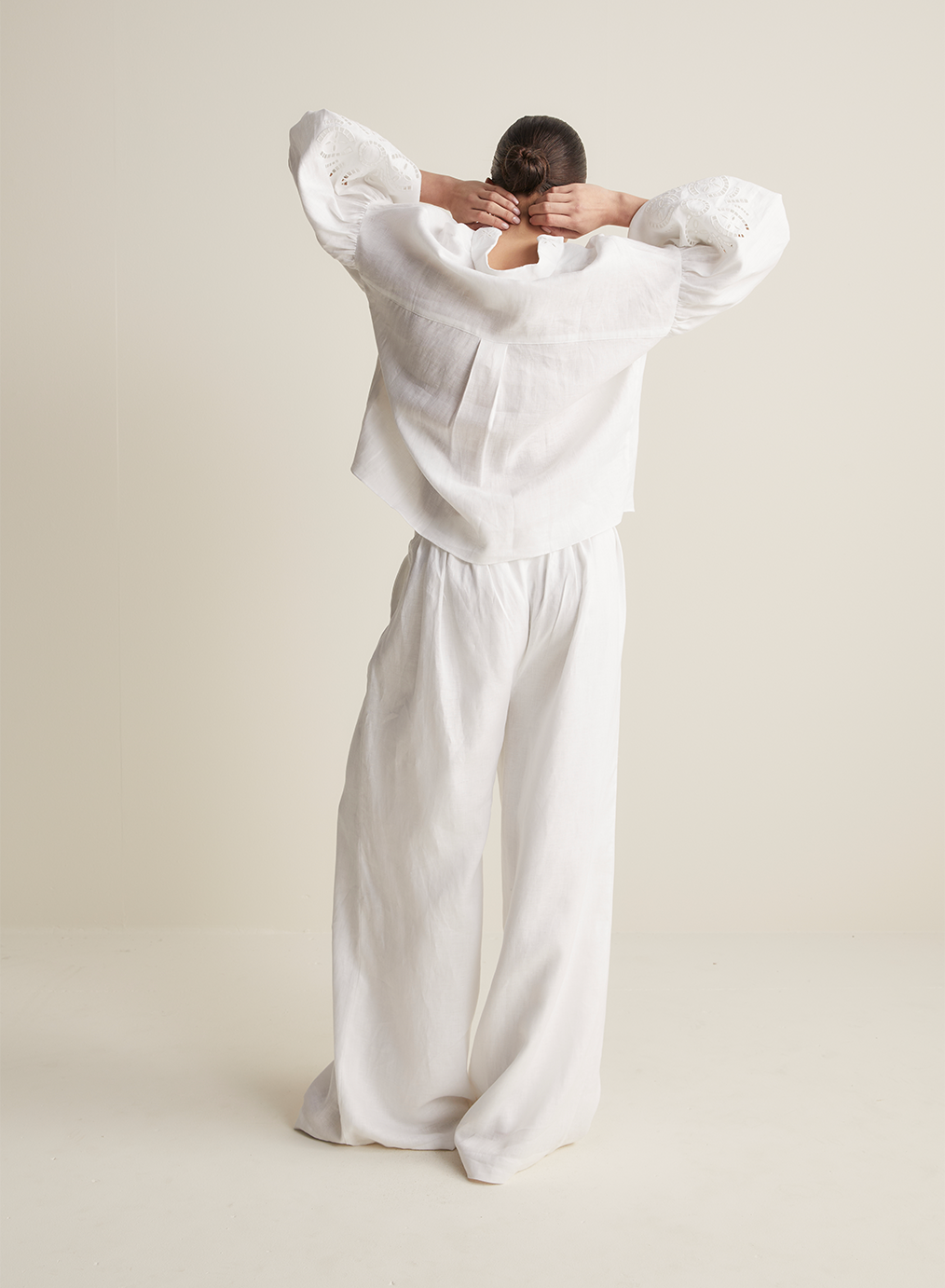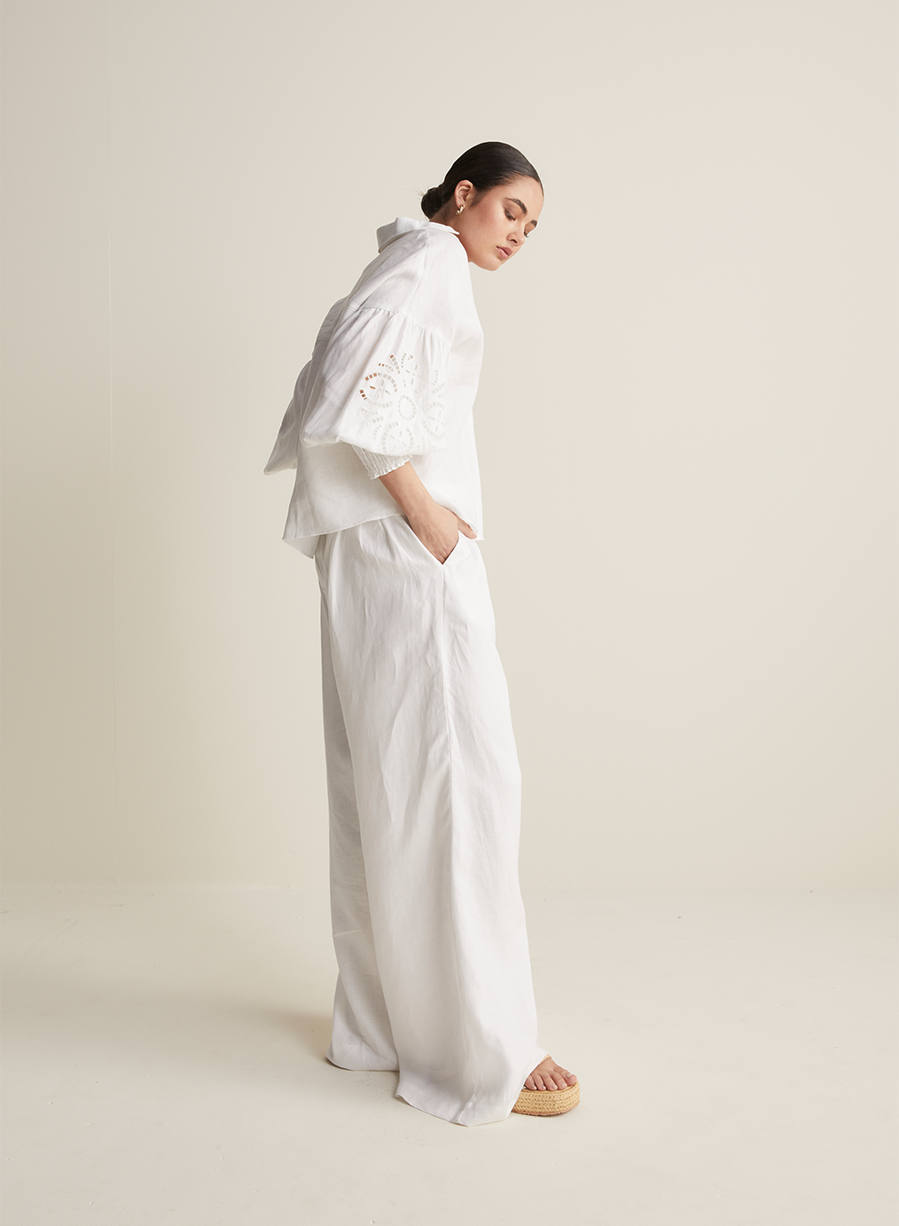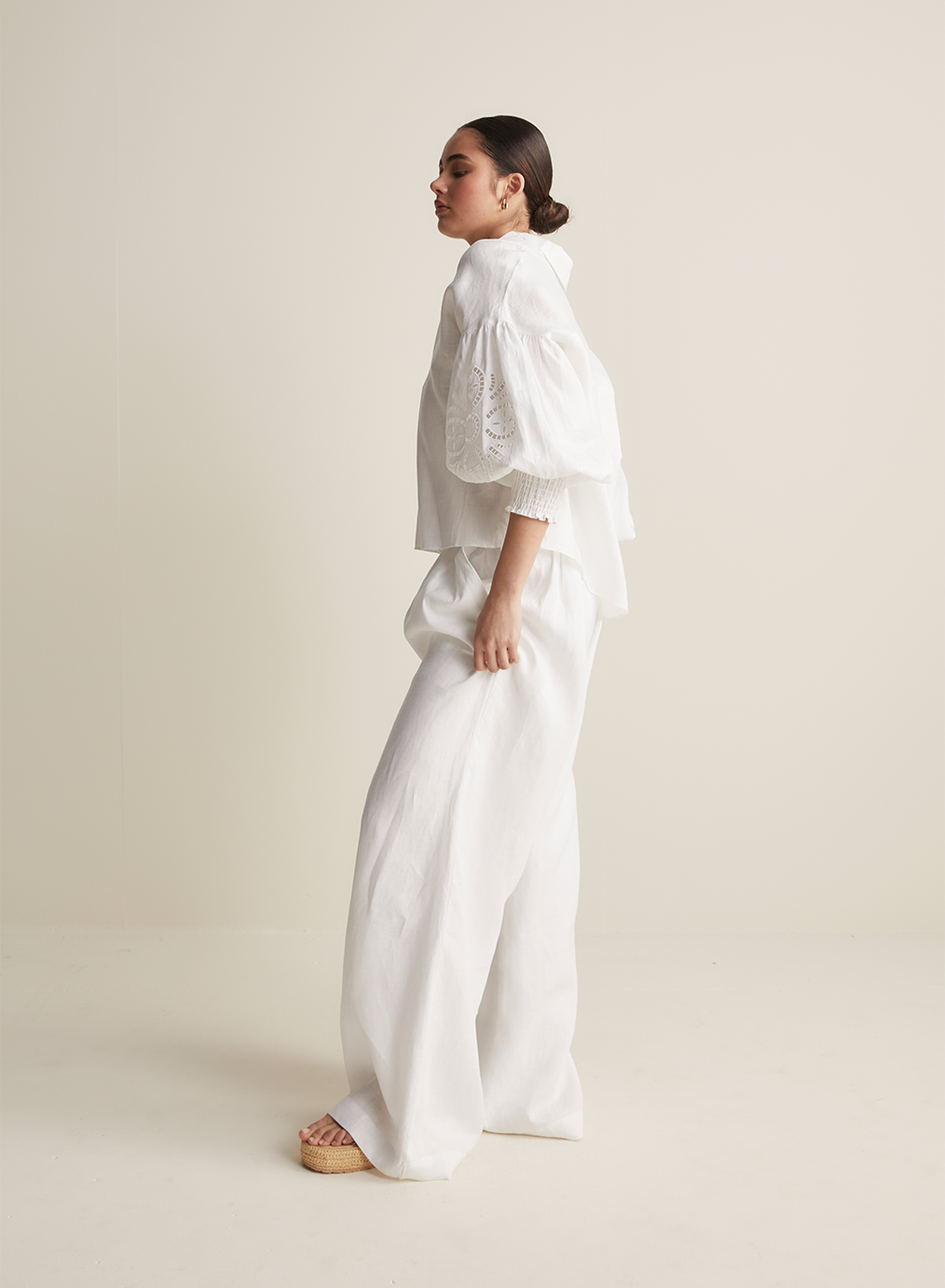 The Devon Pant is a stylish palazzo pant, meticulously crafted from European Flax® linen batiste, boasting a flattering elastic waist and delicate pintucks.