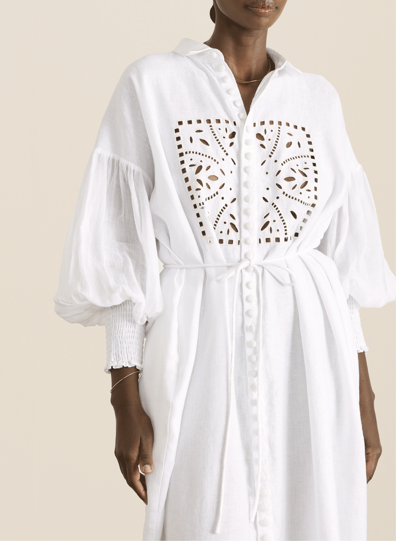 The Jeanne is an oversized mid-length dress crafted from luxurious European Flax® Linen Batiste and Ramie Organdy, creating a soft linen look. Featuring artisan in-house designed eyelet embroidery & bubbled sleeves with a shirred hem to create a gently billowed silhouette.